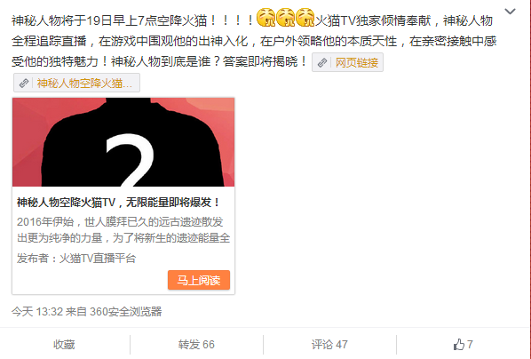 今天上午火猫TV的官博发布了这样一则新闻,神秘人物空降火猫,而图片给的是大家相当熟悉的EE头像,EEsama本来在中国的人气非常高,难道真要来火猫开直播了吗?