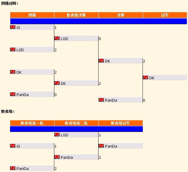 最终决赛里,DK以2:0战胜PANDA,以全胜战绩获得了WGT2012 Dota项目冠军。