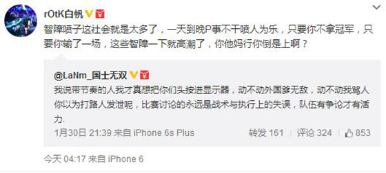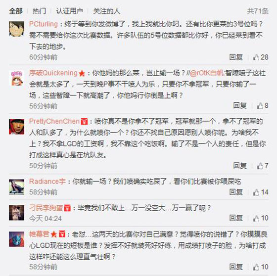 而在离开MDL舞台之后,老队长在微博上怒刚了粉丝一波,“智障喷子这社会就是太多了,一天到晚P事不干喷人为乐。只要你不拿冠军,只要你输了一场,这些智障一下就高潮了。”最后,老队长还甩下一句“你他妈行你倒是上啊”!