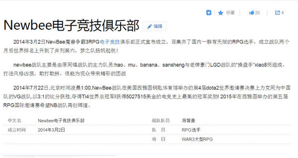 早在12月20日的KDL中韩明星赛后,强行支付给Rave的Newbee便成为了DOTA2圈中的热门话题。身批着TI4冠军头衔的荣耀之师却被来自韩国联赛,在i联赛中不敌OB战队的Rave战队拿下一场。彼时的Newbee队员们完全没有任何训练打算,却能够从容直播魔兽RPG到深夜,这种态度自然让一些偏激的玩家不能接受,于是百度向公众开放编辑的词条一度将Newbee战队修改为了以下字样: