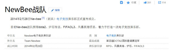 2月1日,Newbee百度百科新版本:RPG分部赫然在列