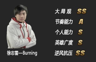 DOTA绝对不是一个光凭操作就能玩好的项目,但没有好的操作基础你连上场资格都没有有。巅峰期的Burning是一个绝对完美的C,超强的对线能力,一流的补刀能力,迅速的反应能力,完美的中后期团战切入输出能力,都完美诠释了Carry这个位置的最终奥义。在CH时期打过chen的经历,以及早年的魔兽对战功底,让他的多线及微操也有非常好的基础。简而言之,burning是一把大刷子,也很会在团战中发挥作用,但2012年几次重大的个人细节及团队沟通失误也是值得Burning深思的,细节决定成败。