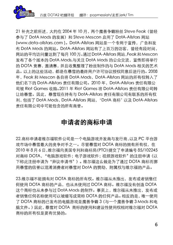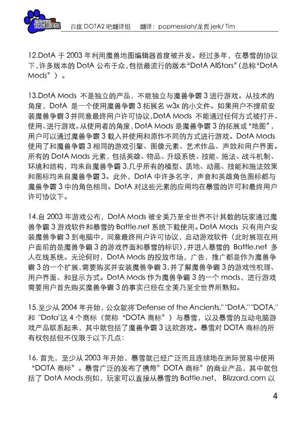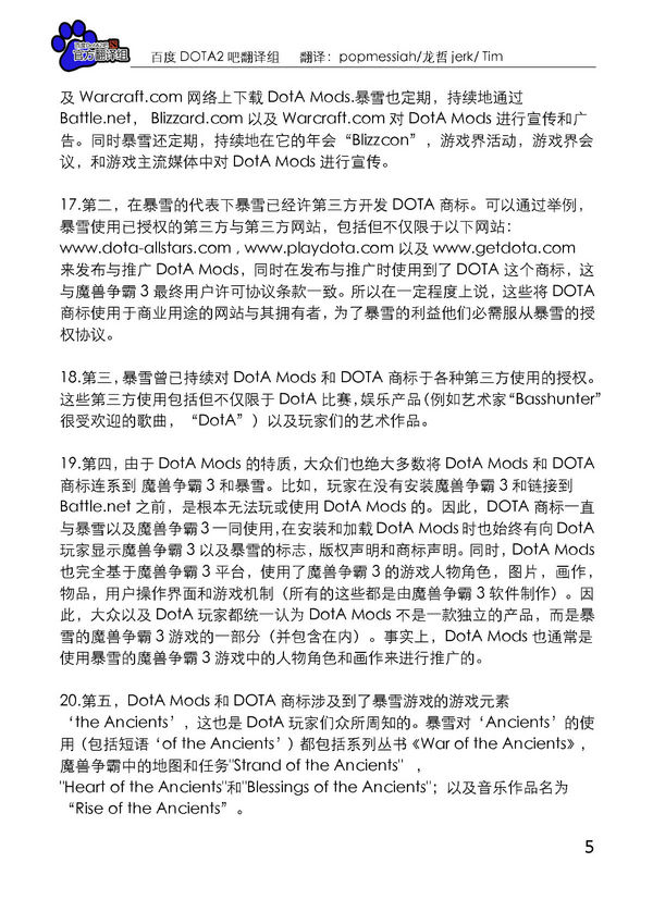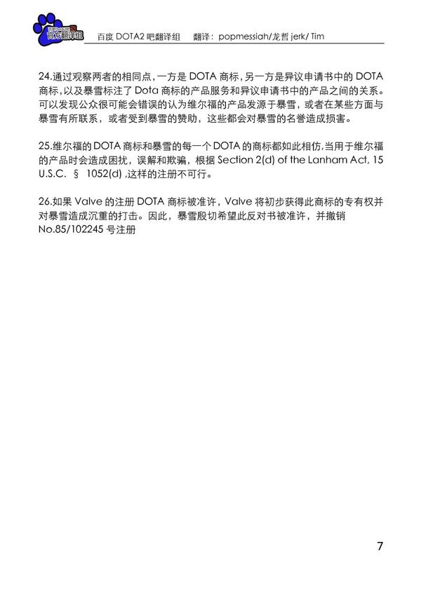 上周,我们为您报道了暴雪暴雪阻Valve注册DotA商标并起诉其侵权的消息(相关阅读),暴雪发起的这次诉讼不仅只有“DOTA”,还包括了“DefenseoftheAncients”、“DotA”和“Dota”。今天,细心的吧友为大家翻译了暴雪反对Valve申请DOTA商标的反对书