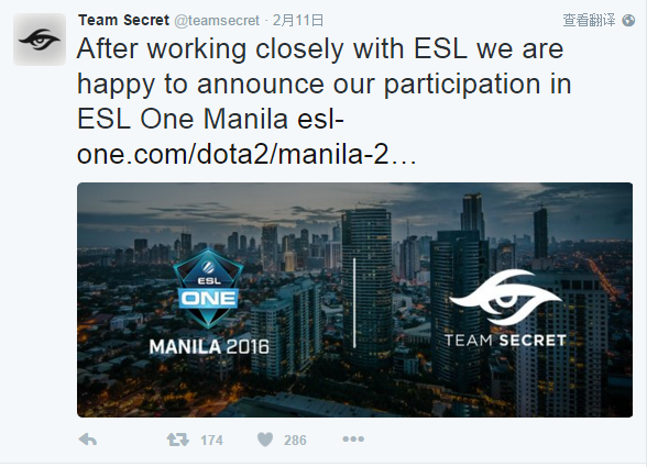 ESL ONE马尼拉站欧洲和美洲预选赛打的火热,而原本宣布放弃ESL ONE马尼拉站的Secret杀了一个回马枪,确认参加这次ESL马尼拉站的比赛..