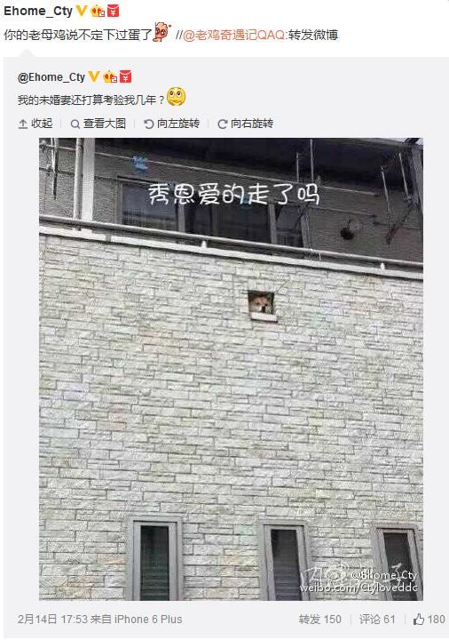 首先是EH的几位队员为我们练手带来了,情人节的段子,我们的未婚妻怎么还没有发货啊?随后老鸡也转发了cty这则微博,被众多玩家吐槽,你的隔壁少妇呢,你的老母鸡呢?