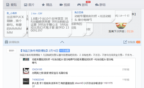 可以理解为国内版的D2L,其中贴吧的交易量以及信息最为丰富。基本上都是玩家发帖进行挂牌,卖家可在其中询盘或者交流,是国内DOTA2玩家使用的较多的交易方式之一。依托于论坛或是贴吧存在,包括了RMB交易以及以物换物的交易方法,应避免大额金钱的直接交易。交易术语介绍,菠菜:稀有物品 麦/软/:RMB 缘分:以物易物 CO:以一定底价拍卖