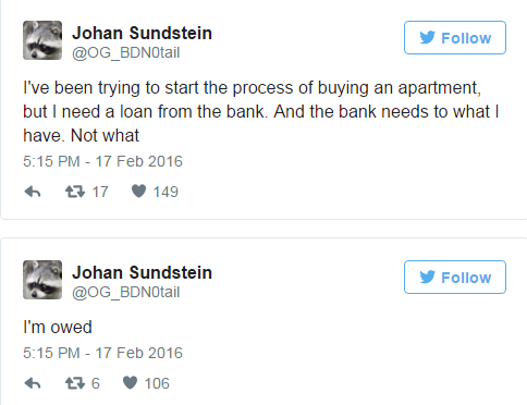 “N0tail说:我想买下一栋公寓,可是我需要银行的贷款。银行需要我拿出我的财产证明而不是我被拖欠工资的证明”