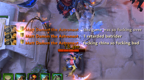 在幽鬼以后的四盘比赛中,MoonMeander的对面都出现Doom这个英雄,MoonMeander在被怼了个四连败后(后三盘的Doom是一个末日绝活哥),公屏打字控诉China太TM脏了!有趣的是他自己也手了盘Doom还是输了hahahaha