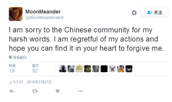 MoonMeander:我很抱歉在中国玩家面前说出这么粗鲁的话,我很后悔并且希望你们能从心里原谅我。