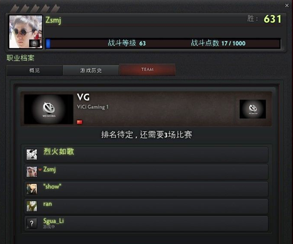 通过截图可以看出,ZSMJ确实已经加入了VG战队,其他几名成员分别为烈火如歌、Show、ran和Li,而之前ZSMJ在