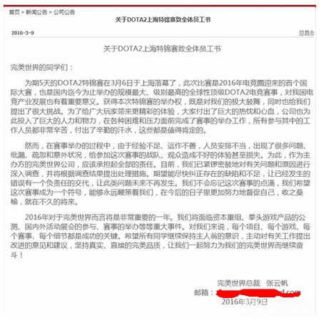完美公告:就DOTA2上海特锦赛致全体员工书