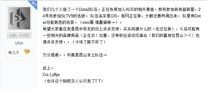 早在DOTA2 CIS刚组队的时候,Lyfljw就曾在贴吧发帖想要引起众人的关注,虽然支持的人不少,但是和媒体曝光相比就收效甚微了。DOTA2 CIS作为一只新星战队,令人眼前一亮,正所谓出身牛犊不怕虎,打起比赛来什么英雄都敢选,什么阵容都敢干,小编认为如果现在炸弹人被开发出来并且解禁,那我们在比赛中看到DOTA2 CIS战队使用它,一点也不会感到奇怪,相反传统豪强则没有这样的魄力。