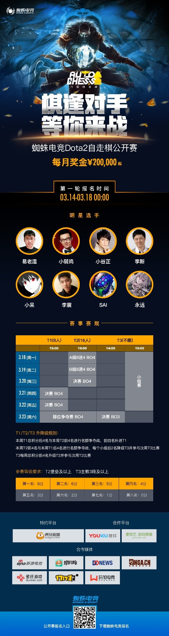 继蜘蛛电竞Apex英雄公开赛后,国内领先的电竞网络蜘蛛电竞将在3月18日举办DOTA2自走棋比赛,报名通道已经开启,3月15-3月18日00:00,下载蜘蛛电竞APP即刻报名参赛!(报名成功之后需加赛事QQ群:416177559) &nb