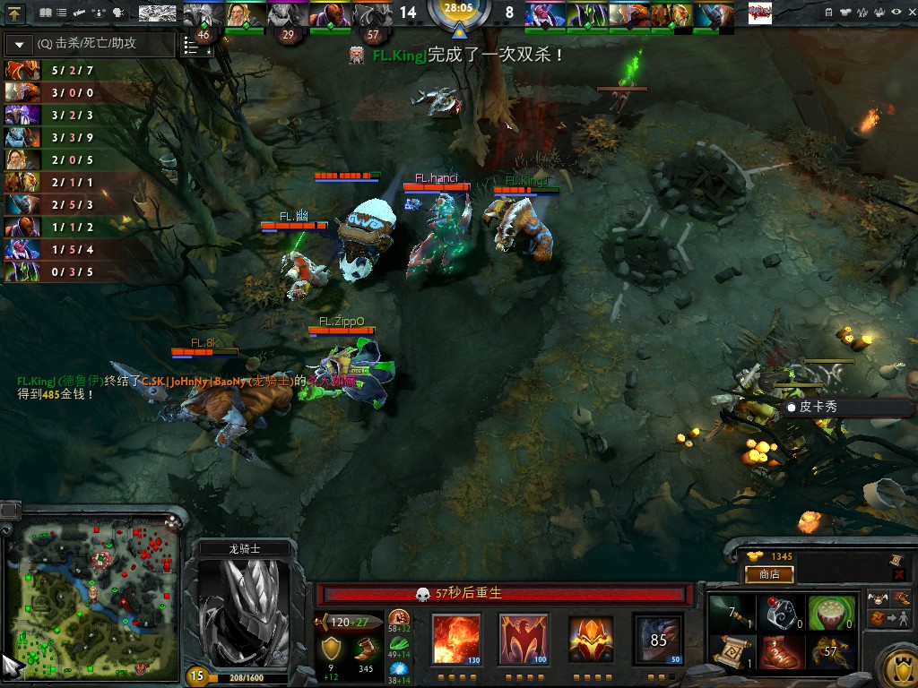 比赛持续到28分钟天辉一直保持优势的gank公式在一波开5强杀德鲁伊未遂,结果被马格纳斯完美跳大控制反杀带走全场最肥的龙骑黑暗贤者和双头龙也相继阵亡。FL气势大涨顺势拿下肉山。