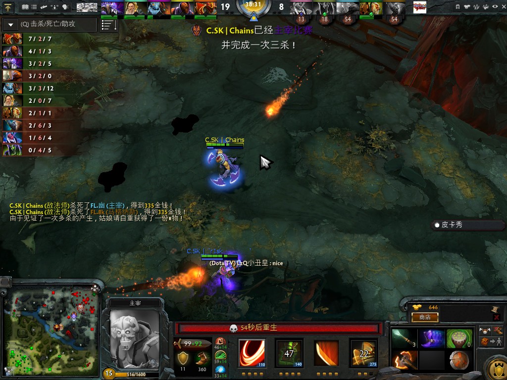 FL趁对方回城补状态强拿肉山,拿完肉山天辉众人赶到敌法师一波先手秒掉后排法师顺带打掉了德鲁伊2条命。最终一波推进下路高地FL无力打出GG。