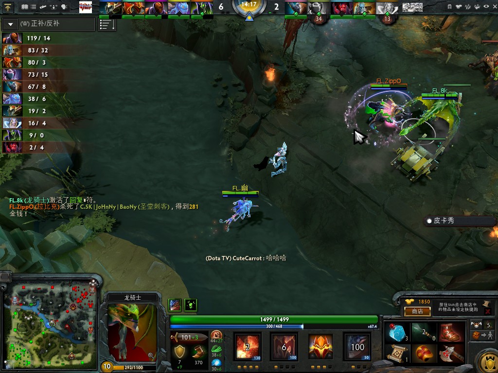 阵容选择上FL ban掉上把让他们非常头疼的双头龙、光法还有黑暗贤者拿到了对方最擅长的敌法师和龙骑一套控制多爆发足的阵容