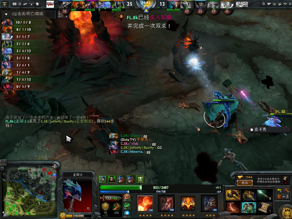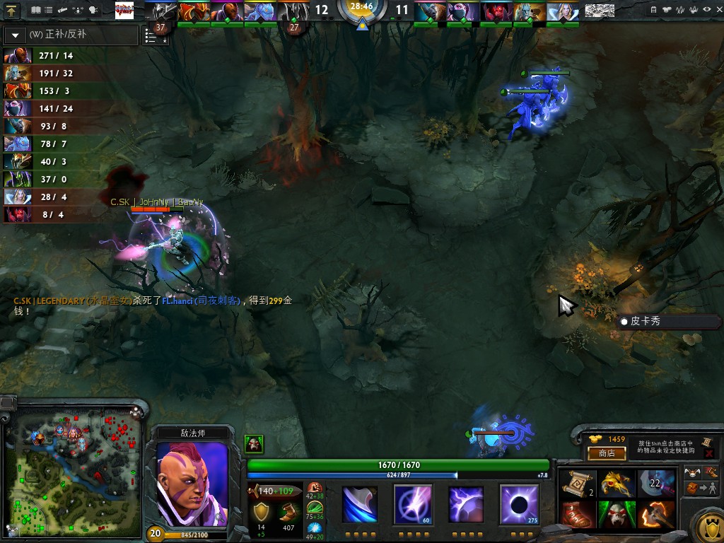 28分钟 BKB敌法师想配合队友击杀对方猴子,但是因为没有带粉被猴子残血逃跑。而己方的酱油小强和拉比克也被击杀一波gank不成被人反杀局势又再一次扳平。