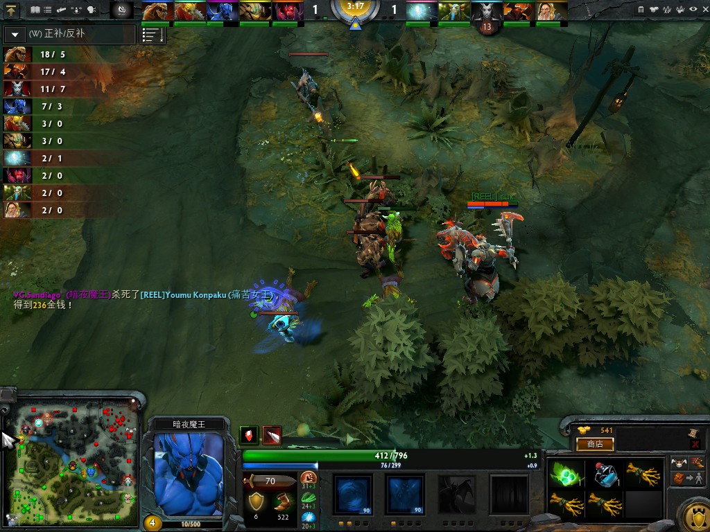 15分钟第一波小规模团战VG除影魔4人集结下路推进对方1塔,破塔之后SK塔后一戳留住2人强打一波但是却被支援过来的女王率先秒掉。光法德鲁伊也是相继被击杀,而沉默是偷偷在后排收掉了对方卡在树林里的女王人头暂时落后。