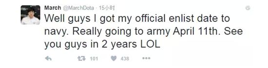 韩国刀塔功勋老队长在MVP.P全胜DotaPit#4夺冠后发推特表示将服海军兵役2年.