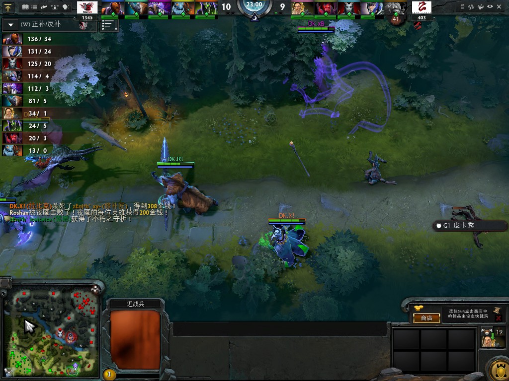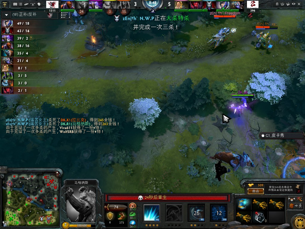 8分钟猛犸在没有大招的情况下来下路支援虽然先手秒掉暗影恶魔但是女王的及时支援是反杀掉敌法师,接着追击残血的双头龙和拉比克也是被女王收掉。敌法师在复活后第一时间赶来追杀TK但是被TP下来的露娜开大直接收掉。DK局势大为不妙!