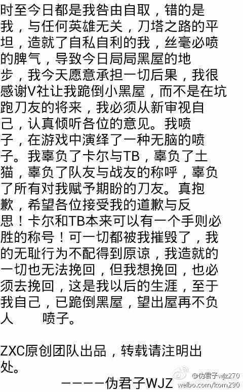 时至今日都是我咎由自取,错的是我,与任何英雄无关,刀塔之路的平坦,造就了自私自利的我,丝毫必喷的脾气,导致今日局局黑屋的地步,我今天愿意承担一切后果,我很感谢V社让我跪倒小黑屋,而不是在坑跑刀友的将来,我必须从新审视自己,认真倾听各位的意见。我喷子,在游戏中演绎了一种无脑的喷子。我辜负了卡尔与TB,辜负了土猫,辜负了队友与战友的称呼,辜负了所有对我赋予期盼的刀友。真抱歉,希望各位接受我的道歉与反思!卡尔和TB本来可以有一个手则必胜的称号!可一切都被我摧毁了,我的无耻行为不配得到原谅,我造就的一切也无法挽回,但我想挽回,也必须去挽回,这是我以后的生涯,至于我自己,已跪倒黑屋,望出屋再不负人
