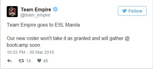 今天早些时候ESL官方给出了声明。声明中表示帝国将会被直接邀请参赛。这沿用了ESL之前的规定,只要战队不解散就不会失去邀请资格。由于Dota2转会期的增多和队伍变化比较大,ESL的举办方决定在此之后只要战队更换多于3名队员,ESL就会重新考虑是不是直接邀请这支队伍。