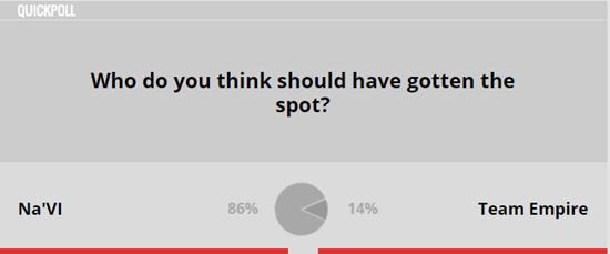 之前Navi的粉丝们表示希望Navi拿到直接邀请资格,因为navi在欧洲区的表现仅次于帝国,而且没有人员上的变动。ESL官方的回复是虽然邀请Navi会给比赛带来更多的乐趣,但是这次邀请还是会沿用之前的的规定。