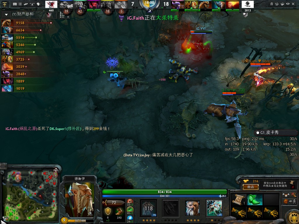 14分钟蝙蝠开5先手跳刀拉到站在后排的痛苦之源在秒掉对方1人的情况下IG选择继续强打在小狗TP下来后痛苦之源是果断买活配合跳刀猛犸的一个完美大招是杀掉对方3人,DK再次局势被逆转。