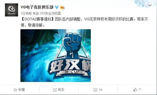 VG战队也发表了官方公告,宣布放弃本周好汉杯进行人员调整。