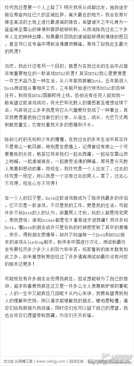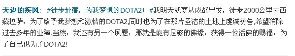今日,一个DOTA/DOTA2测试员为了纪念给了他梦想和激情的DOTA2,从成都徒步前往中国西藏为自己消除多年的业障。引发人们惊呼,我们也祝福这个和我们一样的DotAer能完成自己的梦想。