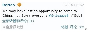 “很抱歉,我们决定退出G-1资格赛,把我们的名额让给EG。