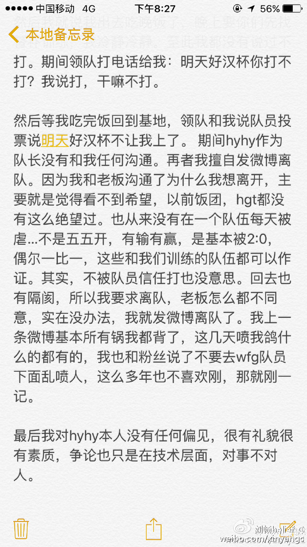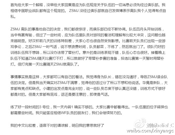 21日下午的六点半WFG战队的另一核心成员HYHY对于ZSMJ离队事件做出了解释。