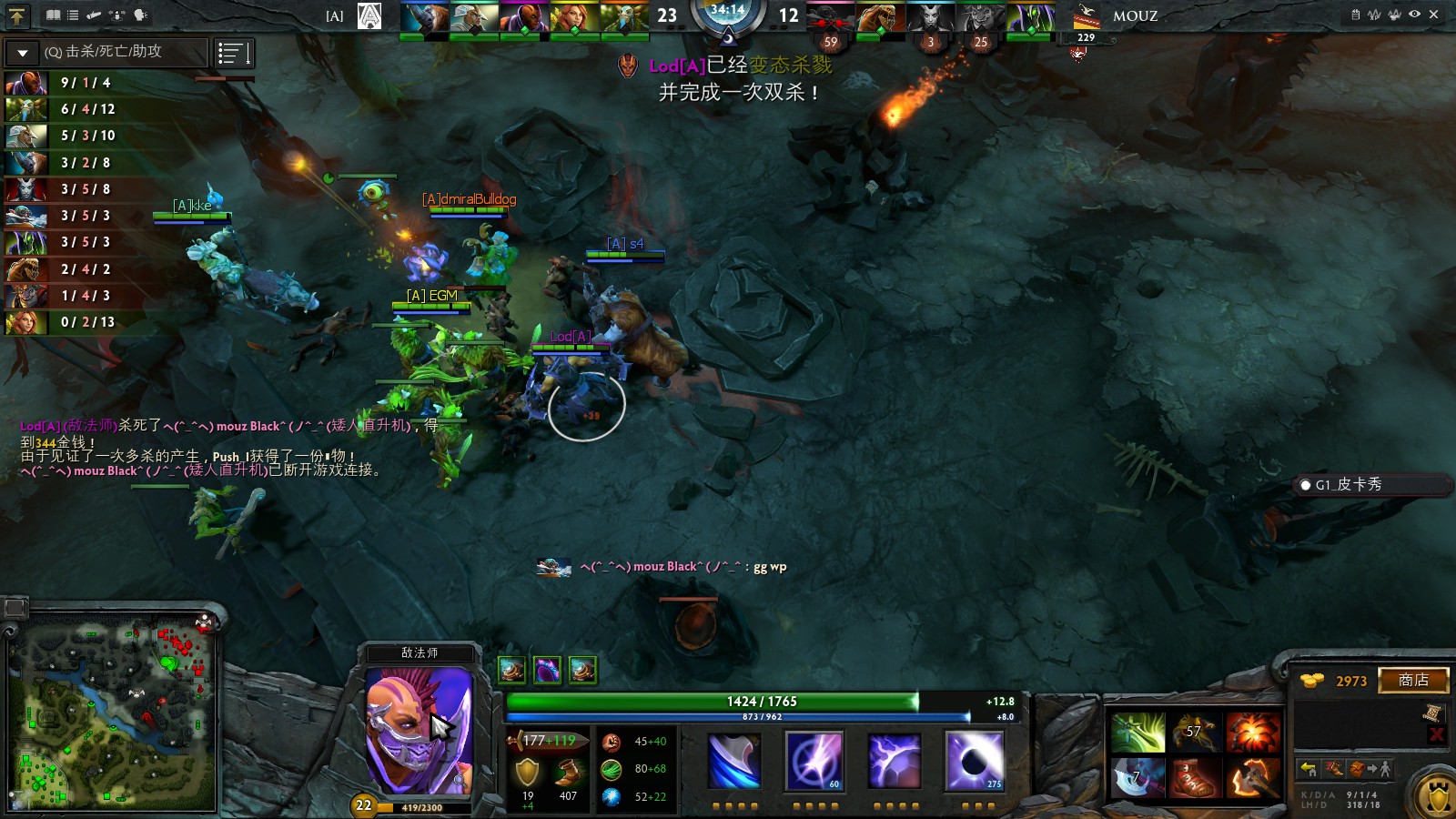 话说loda也乃一代大神Mouz放任敌法师的发育导致了后期能力上完全不及敌法师,每次完美的先手夜魇的输出总是不够再配猛犸的后手大招小团灭几波后Mouz面对敌法师的正面能力无力抵抗果断打出GG!