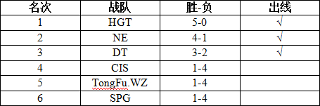 1、六支资格赛队伍CIS、NE、DT、HGT、SPG、TongFu.WZ通过Bo1循环积分赛晋级前三名;