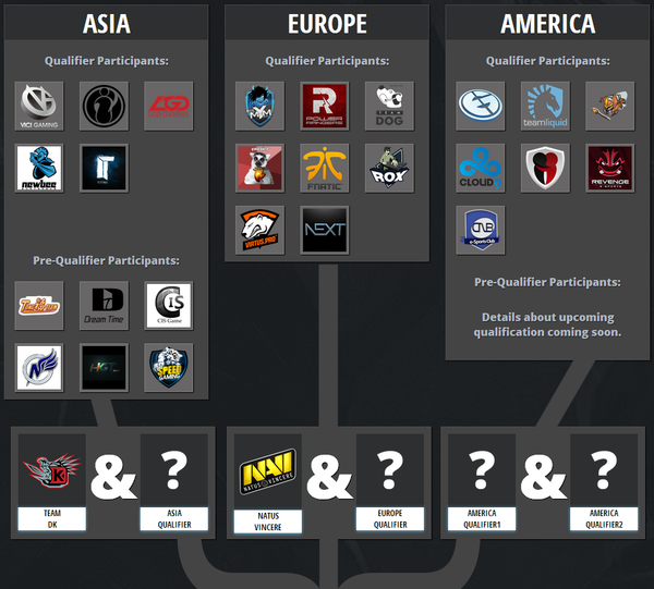 线下总决赛一共六支战队参赛,其中DK与Na’Vi直接受邀,此外北美区预选赛出线两支、欧洲区预选赛出线一支,亚洲区预选赛出线一支。