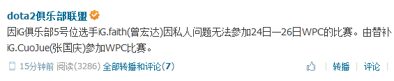 ACE联盟也在今天发布了上图所示的一条消息,最近几日的WPC比赛iG.Faith因私人问题无法参赛,由领队CuoJue替补上阵!