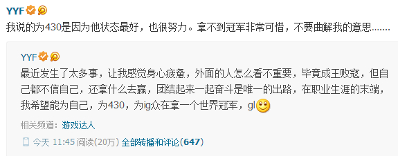 SL9的失利对iG的打击以目前的状况看来确实不小!但队内核心之一的YYF,今日也通过微博向大家表达了自己想要拿冠军的愿望!但Ti4前的圈子动荡已经出现苗头,iG以及Newbee,甚至其他战队会有怎样的变化,一切都是未知数。