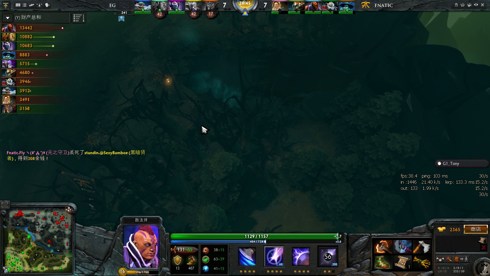 23分钟Fnatic打法偏激选择多人发育牵制但是发现正面团战有点打不过,想要利用飞鞋蓝猫配合线上的敌法师gank但是却效果很差。
