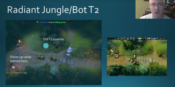 D. 近卫防御塔位置的改变让近卫更容易防御,如下图所示:右边是原来的防御塔位置,左边是现在的位置,左图中的绿点是原来防御塔的位置。可以很清楚的看到近卫防御塔后的空间扩大,更有利于防守方的跳刀先手英雄的埋伏。更重要的是,上方的那条小路在之前版本狭窄又阴暗,很多天灾队伍埋伏再次等待前来防御的近卫军团自投罗网,现在这条小路不仅宽敞而且视野开阔。战略层面来说,TI5上的CDEC告诉人们近卫野区也许是地图上最重要的地区不含之一,首先近卫的野区FARM效率更高,其次近卫的野区直通肉山,掌握近卫野区对于控制全局十分重要,这次近卫防御塔位置的加强让近卫对于自己的野区拥有更强的掌握。