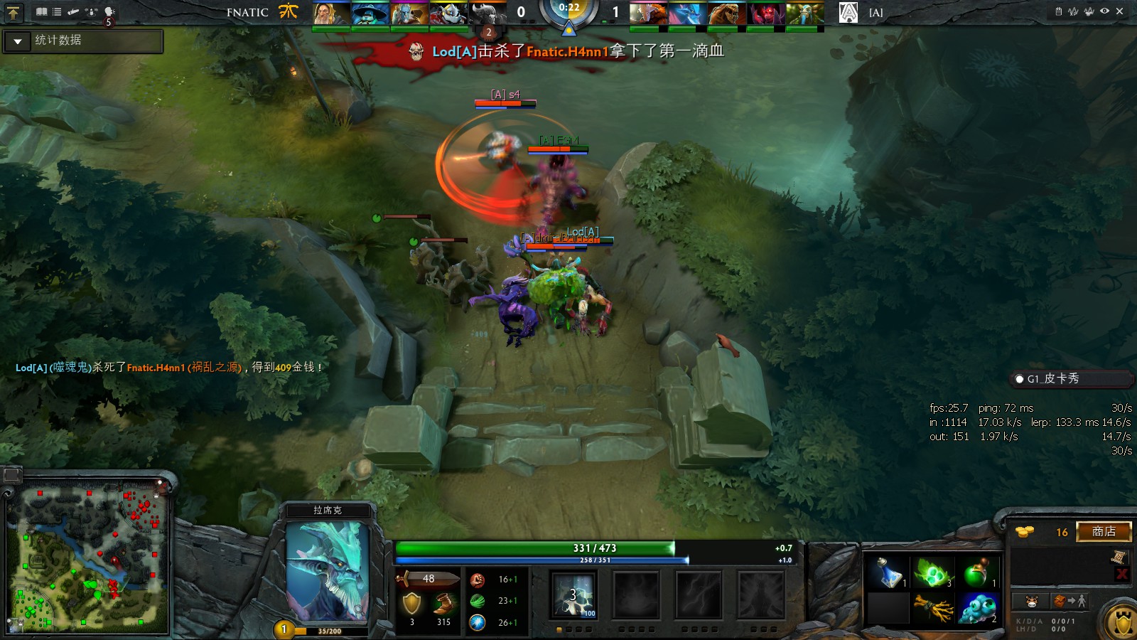 22分钟天辉多人埋伏上路想抓先知,但是小狗却在先知身上抓住时机蓝猫先手配合发条是秒掉了先知但是自己也是阵亡。