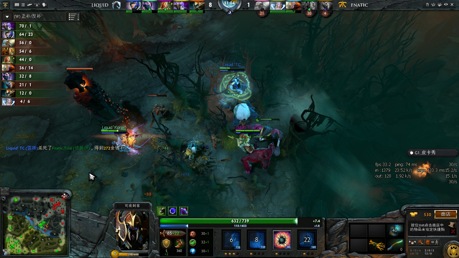 11分钟天辉抓住对方走位不慎逐个击破对方核心,冰女和猛犸走位失误是被秒杀而随后树林里的陈也被多人围剿随后德鲁伊TP下来也是怒送一个人头瞬间Fnatic崩盘。
