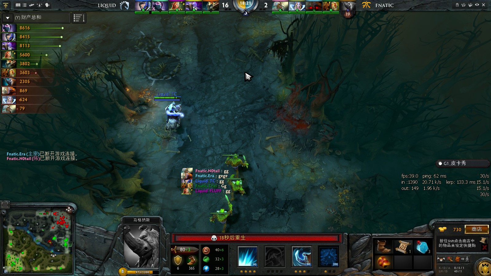 18分钟无奈天辉碾压的全局5人经济排名前5巨大的压制下Fnatic无奈打出GG!