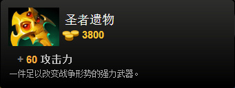 圣者遗物:Dota道具,神秘商店出售,效果为增加持有者60点攻击力,合成辉耀的必备物品。