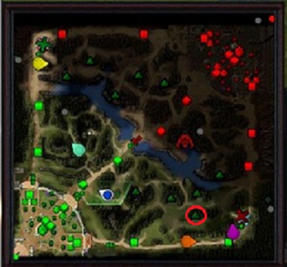 1、天辉的野点主要集中在下路,在15秒或者45秒的时候拉出,就可以吸引到天辉的小兵,将他们拉入树林,拉野点如下图所示: