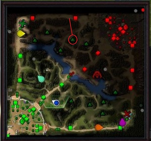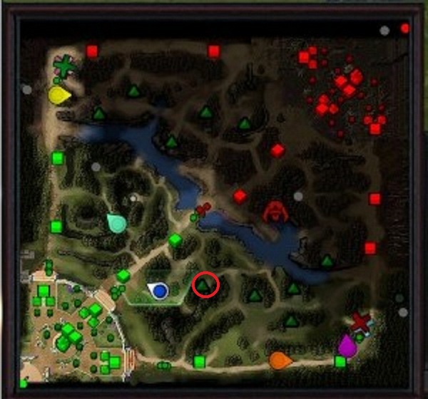 1、天辉的野点主要集中在下路,在15秒或者45秒的时候拉出,就可以吸引到天辉的小兵,将他们拉入树林,拉野点如下图所示: