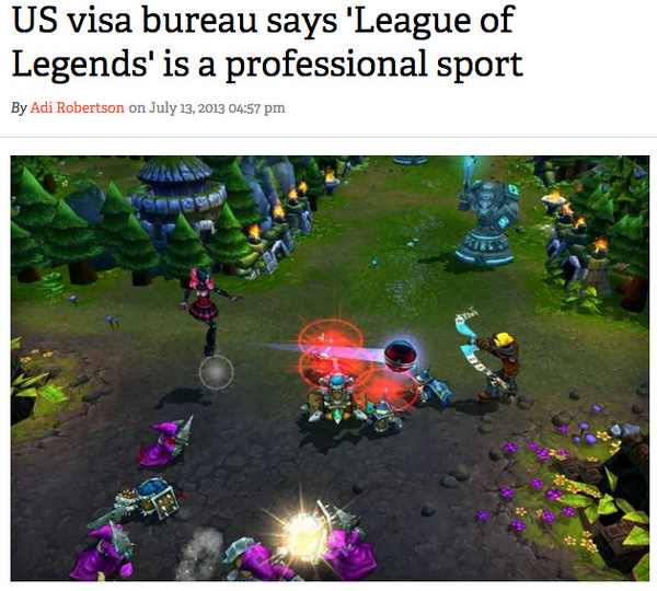 人家LOL在2013年就已经被认可为职业竞技体育,跟NBA,NHL一样,选手能以P1 Visa身份前往美国参赛。
