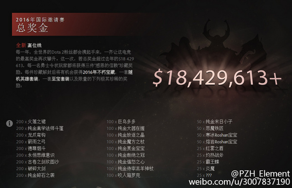 比较爆炸的奖励 如果总奖金超过去年 每个人将获得三件珍藏 有概率开出四大纯正 冰火肉山 纯金饰品 TI信使 韩服国服绝版物品 还有龙钩 箭雨等等 简直爆炸 还有一个???的好奇是什么 大家猜看看
