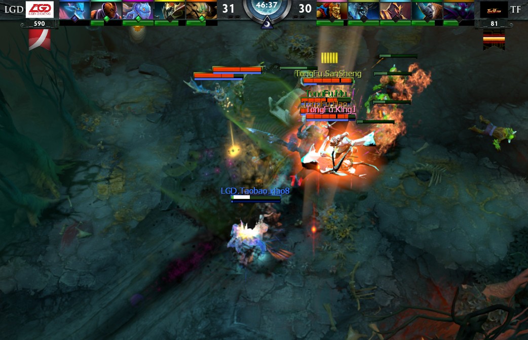 37分钟,LGD开雾抓TongFu,秒杀了对手的马格纳斯和蝙蝠,但是TongFu迅速买活,反秒敌法师,LGD节节败退。TongFu顺手带走了不朽盾。