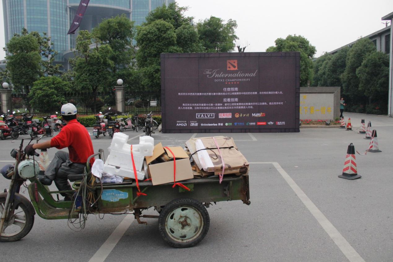 既然是赛场,自然少不了TI4的元素。整个村子道路宽敞,沿途挂满了此次TI4的各种宣传物。随风飞扬的道旗下、路旁巨大的展板前,不时有行色匆匆的工人骑着摩托车、电瓶车飞驰而过。国际化的TI4,与生活化的民众,形成了鲜明的对比。经济支持对电子竞技的发展至关重要,但电竞氛围的培养,却是需要持之以恒的事,急不来,也拉不快。一辆搬运垃圾的三轮车从TI4展板前开过,司机转头茫然地看着宣传板,这个场景打败了此前所有的景致,在我脑中反复重现,久久难以拂去。