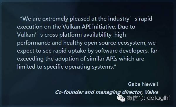 事实上,作为Vulkan的拥簇,Valve一直致力于Vulkan的宣传和推广,DOTA2也是第一批采用Vulkan API的游戏大作之一,Vulkan也毫不避讳的帖出了G胖的赞美之词: